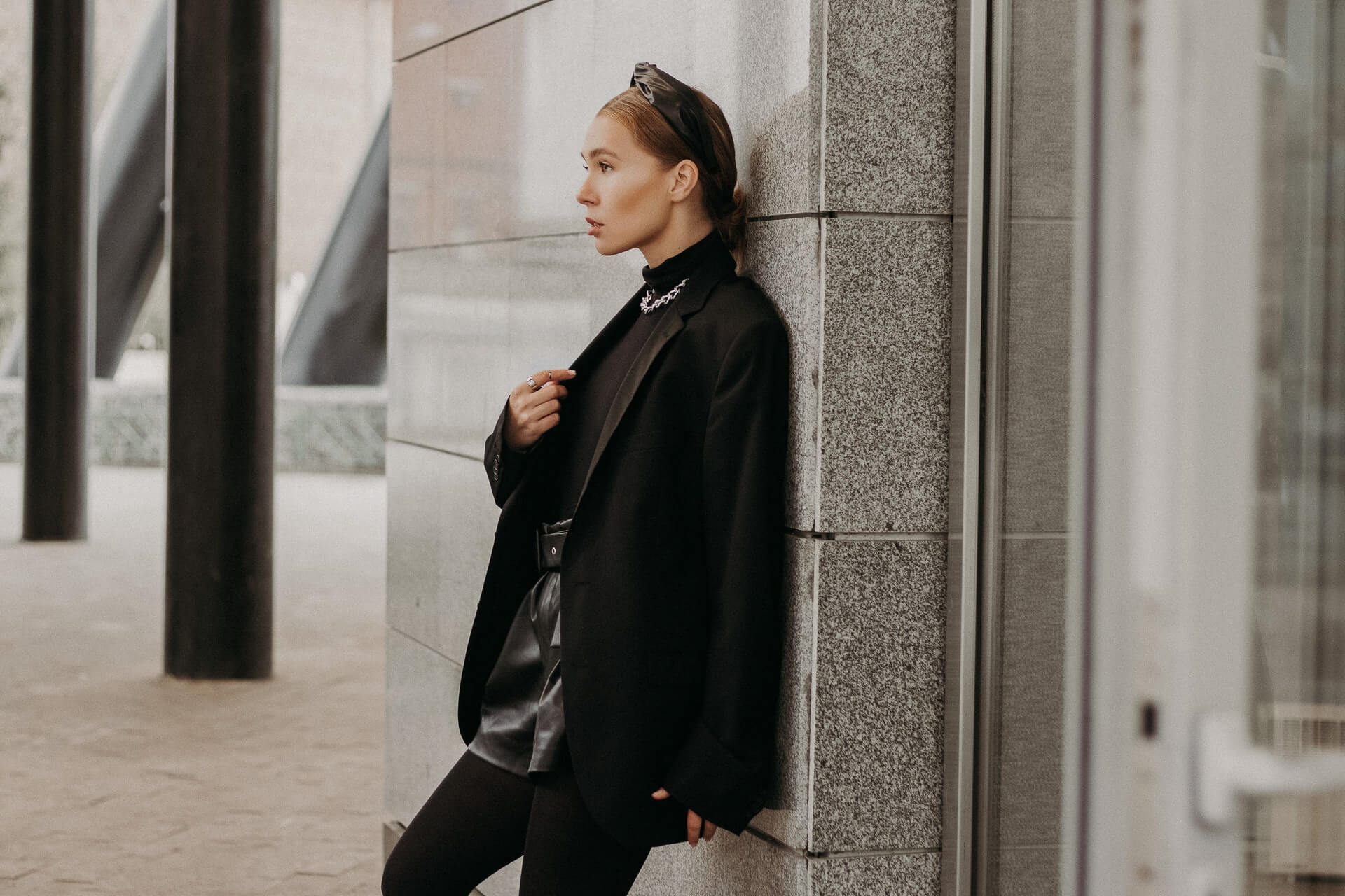 o rochie midi neutra in linie A, adidasi negri, un blazer negru supradimensionat si o geanta neagra pentru un aspect monocromatic elegant