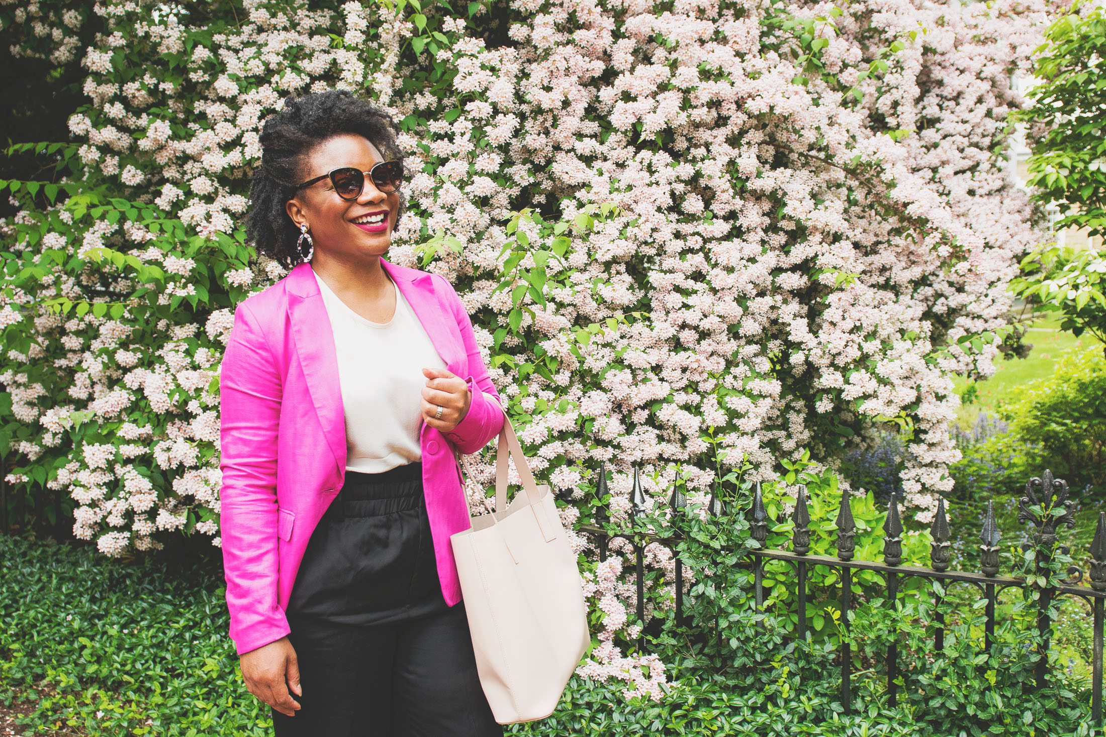 un look total black, cu un guler, pantaloni si pantofi, un blazer supradimensionat roz aprins si o geanta fucsia